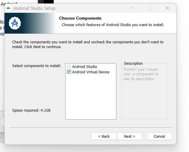 - Pada bagian "Select components to install", apabila spek mencukupi, pastikan Android Virtual Device dicentang. Ini diperlukan agar kita bisa menjalankan emulator HP di laptop tanpa perlu HP fisik. Akan tetapi apabila spek laptop/komputer anda pas pasan, bisa tidak dicentang karena membutuhkan spek lumayan