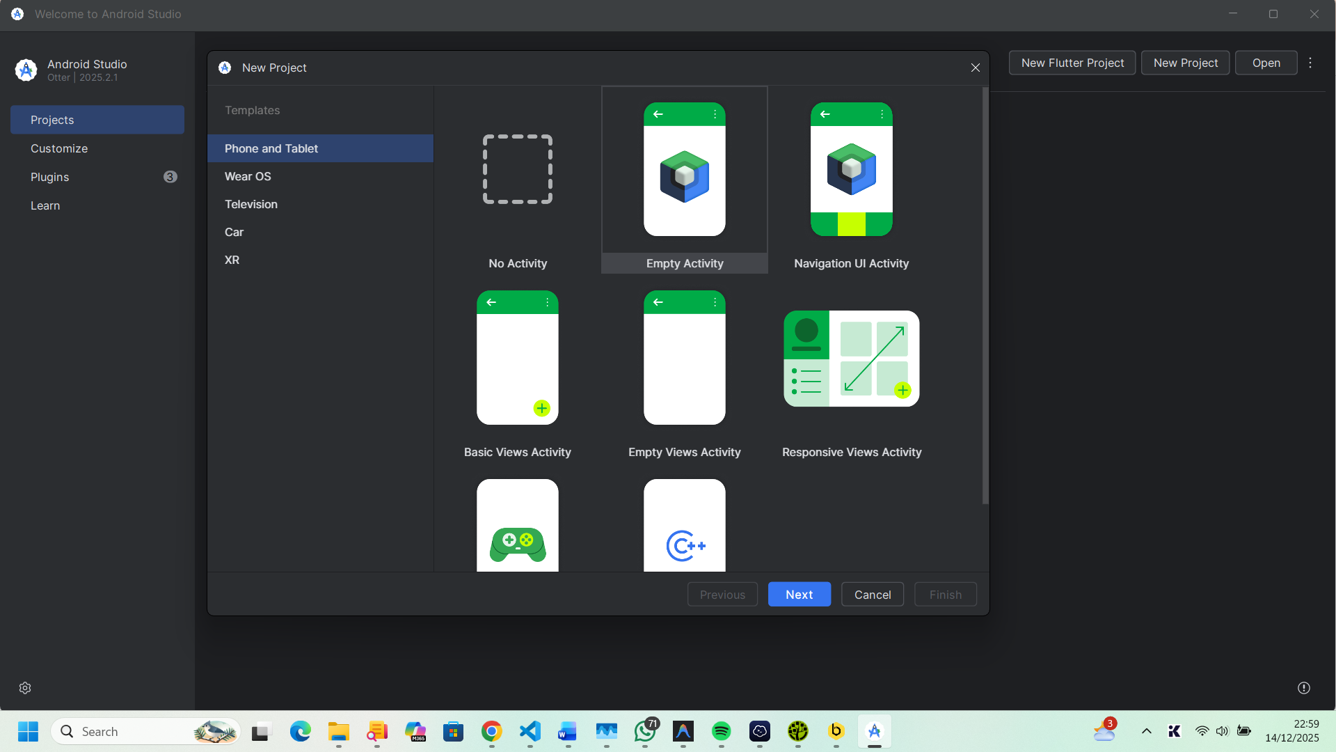 - Pilih Empty Views Activity (untuk tampilan klasik XML) atau Empty Activity (jika ingin menggunakan Jetpack Compose). Untuk tutorial ini, saya menggunakan template standar.