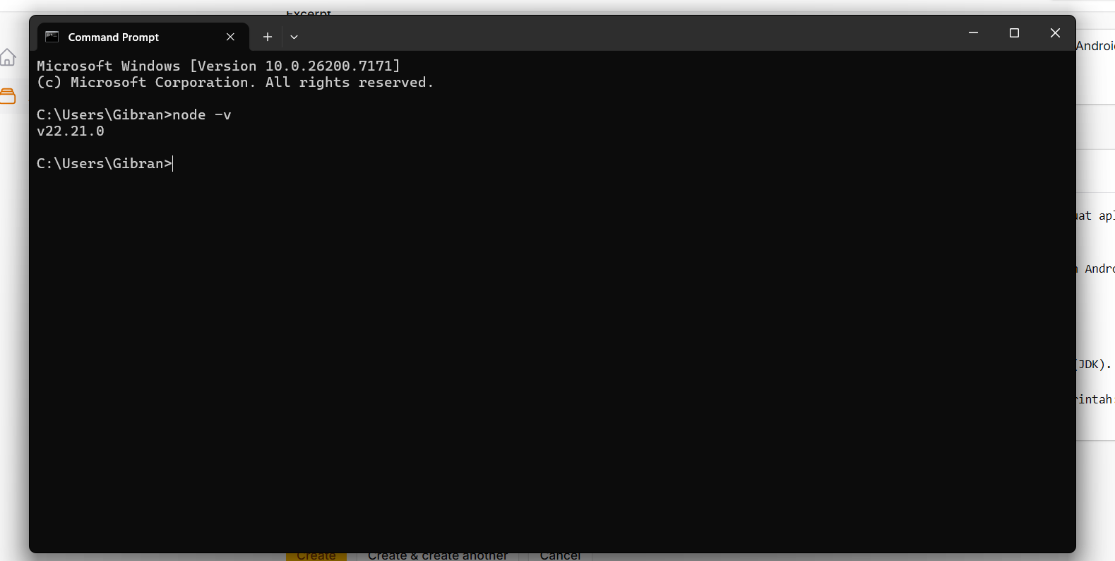 Hasilnya, terminal menampilkan versi v22.21.0, yang menandakan bahwa komputer saya sudah siap untuk menjalankan perintah-perintah React Native.