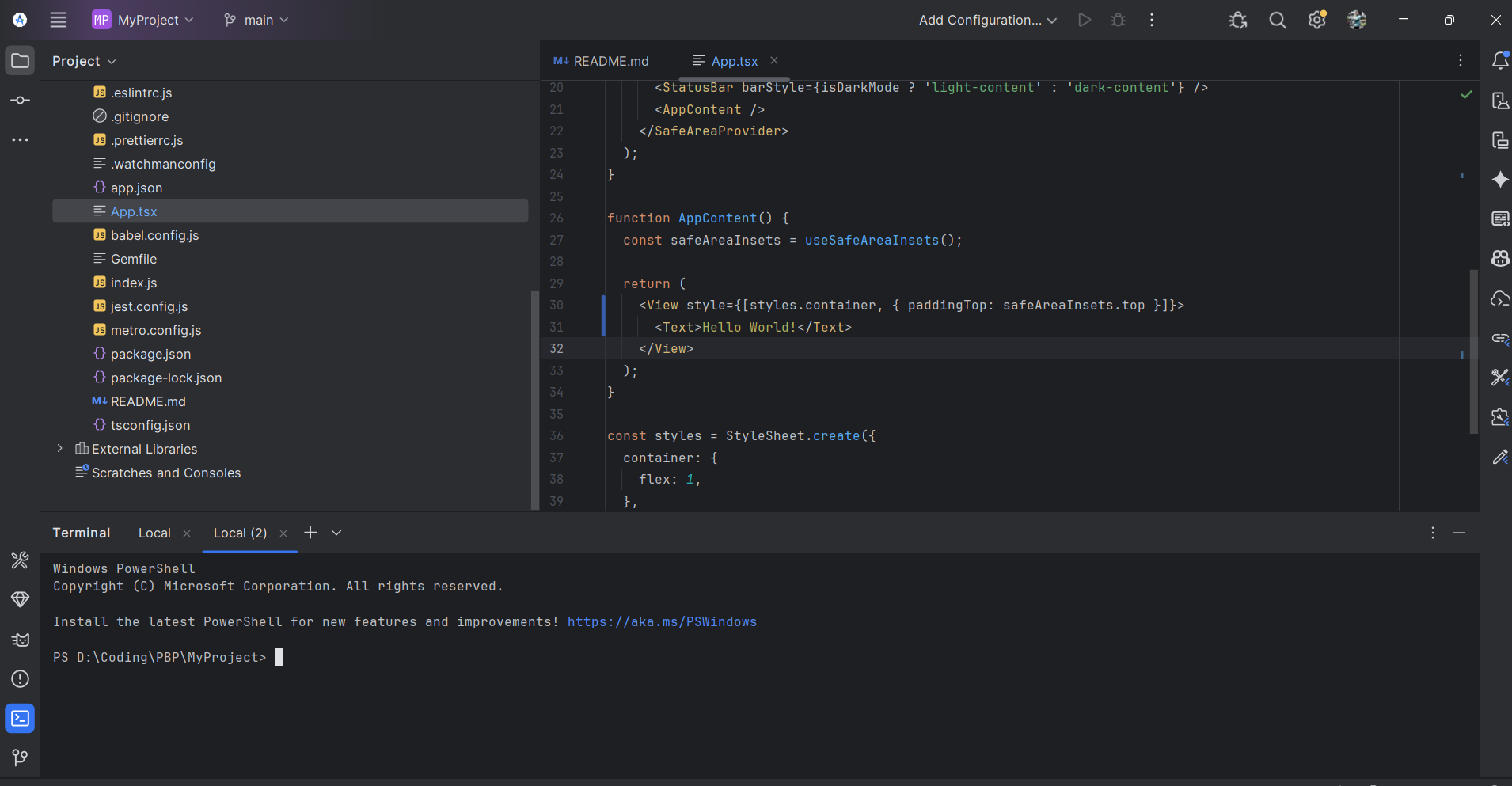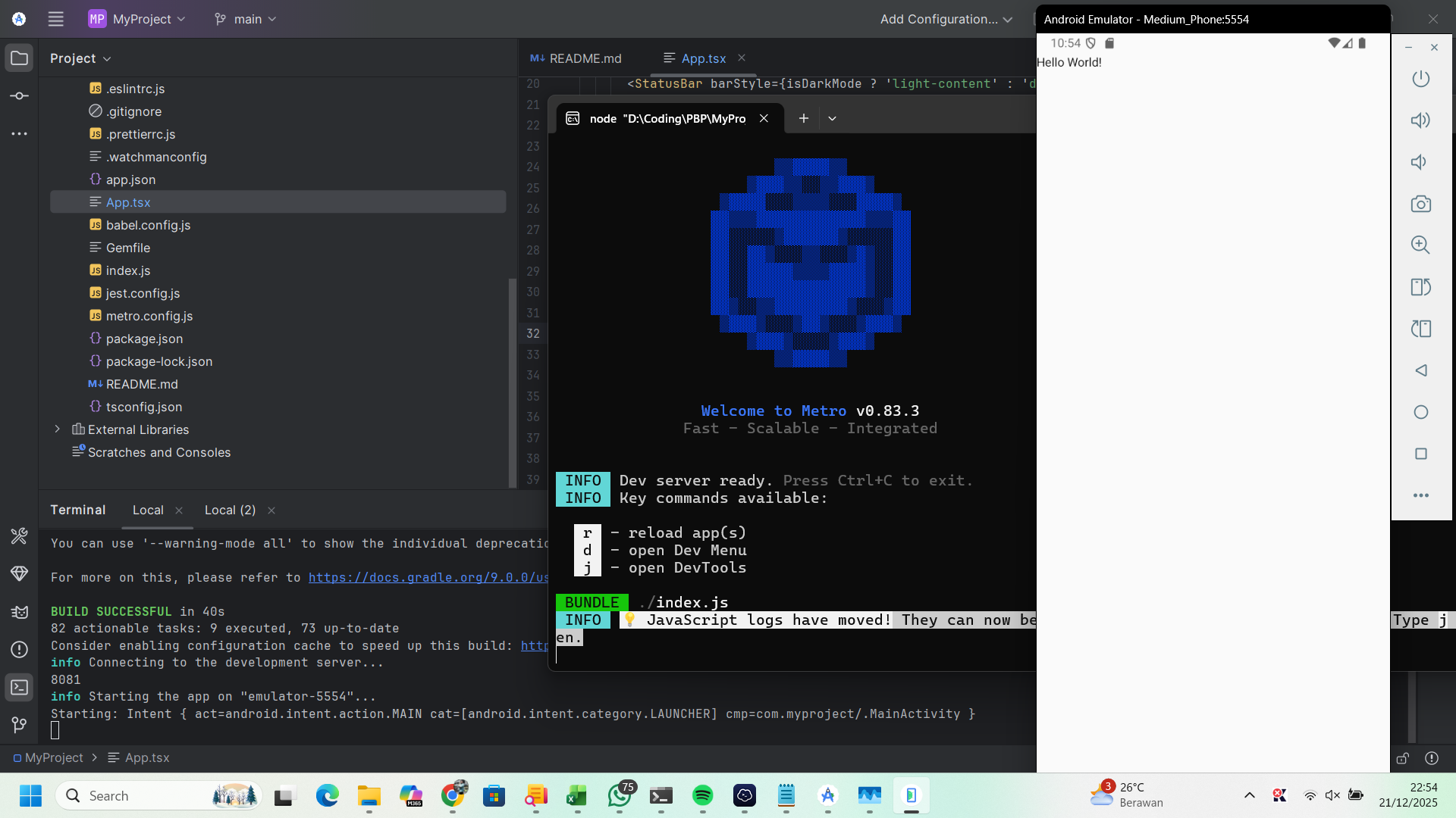 Berikut adalah dokumentasi praktikum saya dalam membuat aplikasi React Native pertama bernama "MyProject".